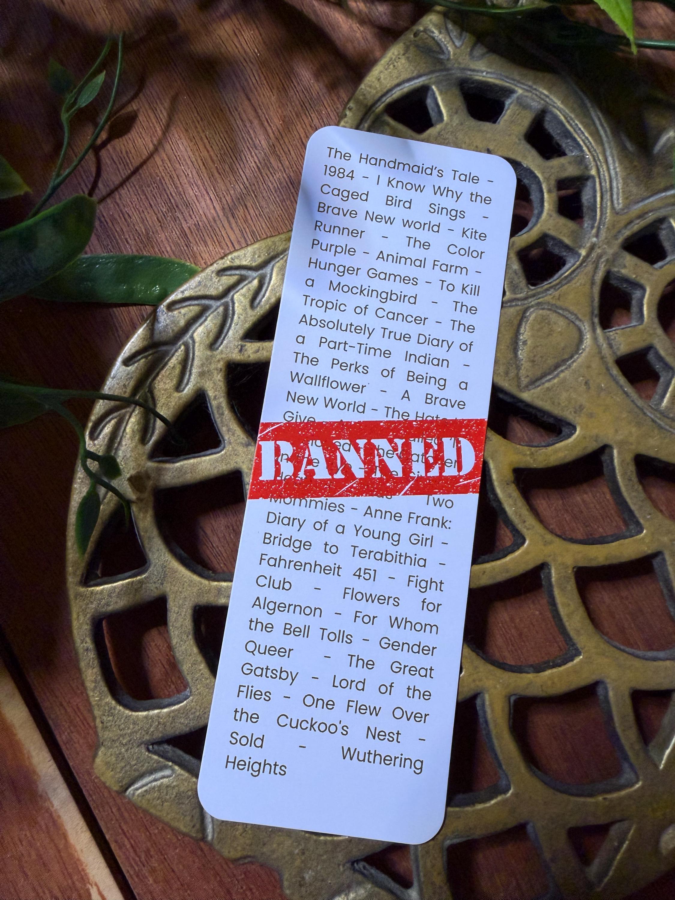 Some stories are too powerful to be ignored. This bookmark features a curated list of frequently banned and challenged books, honoring the voices that sparked conversation, controversy, and change.